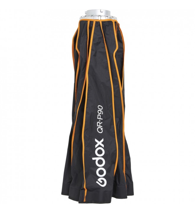 Godox QR-P90 svetlobno okno premera 90cm s srebrno notranjostjo ima obliko tulipana in je zaradi te oblike zelo natančen pri osvetljevanju. Softbox QRP90 je primeren za napredno in profesionalno studijsko fotografijo (portretna, produktna fotografija, akti, fotografija hrane, ...) in za teren (poročna fotografija, modna fotografija, fotografiranje dogodkov, ...)