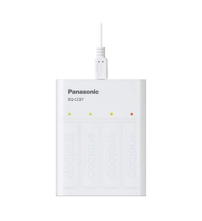 Kompaktni hitri 4-kanalni polnilnik za 4 AA ali AAA NiMH polnilne baterije s 3-barvnim prikazom stanja, za vsak kanal posebej. Hkrati lahko polnite katerokoli kombinacijo AA in AAA baterij. Čas polnjenja za 2 AA bateriji je cca. 2.25 ure, za 4 AA baterije pa cca 4,5 ure. Polnilnik ima priložen USB kabel, s katerim ga lahko priključite na združljiv AC adapter (npr. tistega, s katerim polnite telefon ali tablico). Polnilnik omogoča USB out, kar pomeni, da lahko iz vstavljenih baterij polnite npr. vaš telefon (polni tudi, če vstavite alkalne baterije). V kompletu s 4x eneloop AA 1900mAh polnilnimi baterijami.