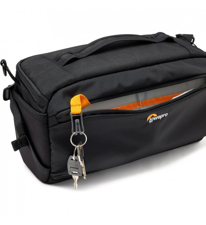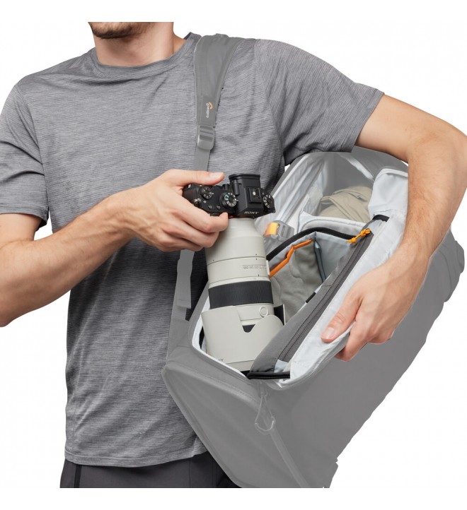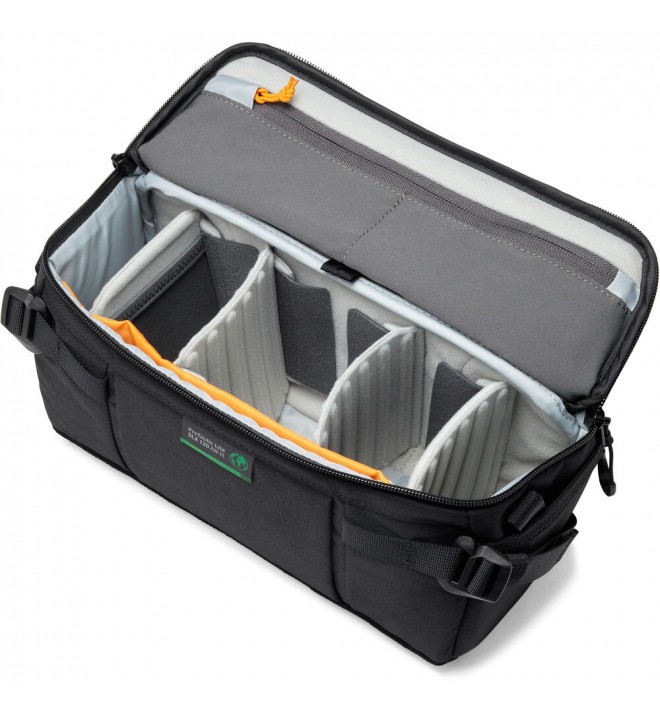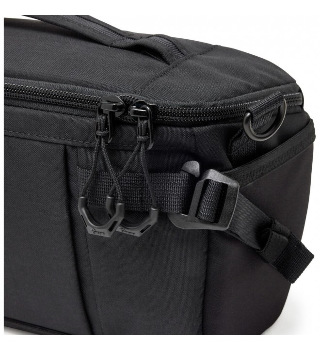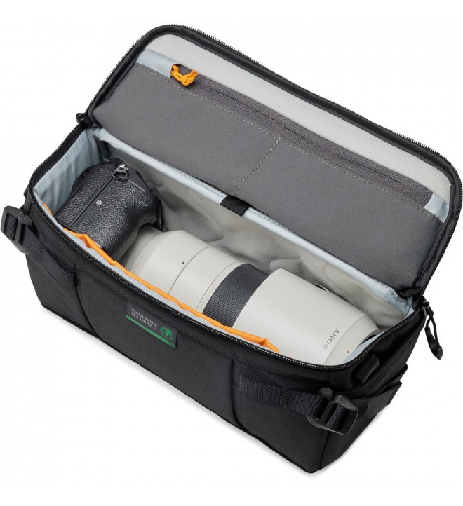 Nosite in zaščitite svoj foto komplet v torbi Lowepro ProTactic Lite SLX 120 AW III s prostornino 5 l. Vanjo lahko pospravite brezzrcalni fotoaparat polnega formata z objektivom 70–200 mm. Ima zgornji ročaj za nošenje in odstranljiv naramni trak za nošenje prek rame. Ima več žepov, vključno z raztegljivimi stranskimi žepi za pokrovčke leč, sprednji žep z vrvico za ključe, žep na vratih z zadrgo in ravno oblazinjen žep na zadnji strani. Z pregradami MaxFit lahko prilagodite notranjost, da se kar najbolje prilega vaši opremi.