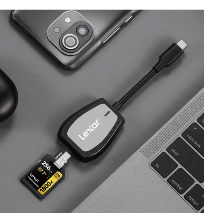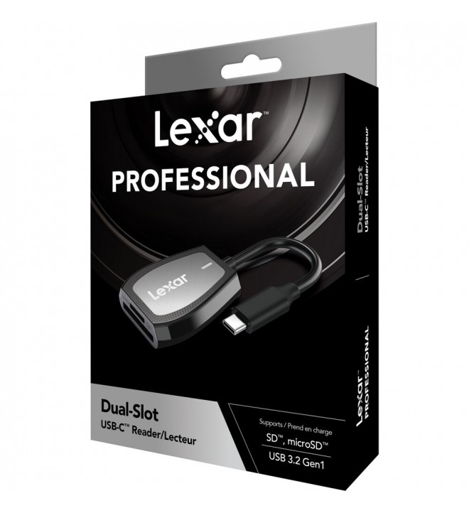 Zasnovan za profesionalne fotografe in videografe, ki želijo pospešiti svoj potek dela s hitrimi prenosi datotek, medtem ko so na poti, profesionalni bralnik kartic USB Type-C z dvojno režo ponudnikov Lexar ponuja uporabnikom dvojne reže za kartice, od katerih ena podpira kartice SD/SDHC/SDXC, druga pa podpira kartice microSD/SDHC/SDXC. Obe reži podpirata hitrost prenosa UHS-II do 312 MB/s, hkrati pa zagotavljata hitrost prenosa do 170 MB/s za medije UHS-I. Ta bralnik kartic ima vgrajen kabel USB 3.2 Gen 1 Type-C, ki je nazaj združljiv z USB 2.0, ter LED lučko aktivnosti, ki označuje njegovo delovno stanje.