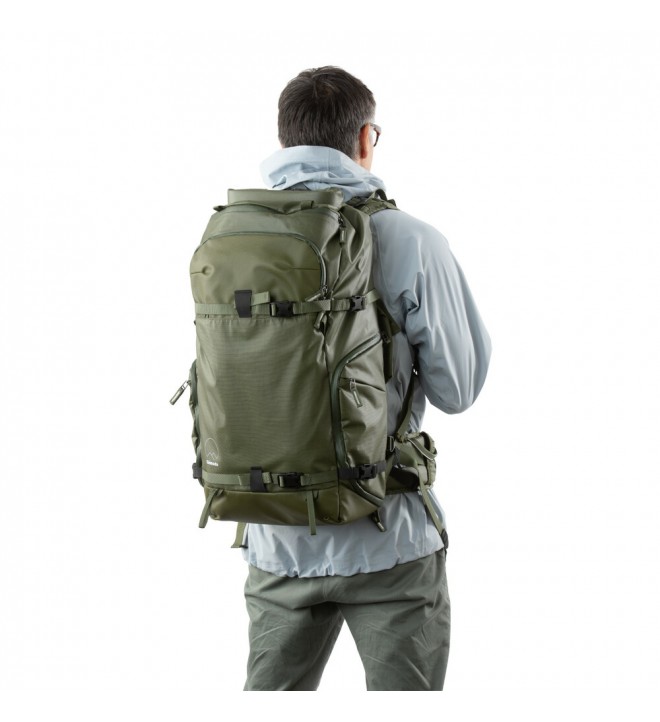 Shimoda Action X 50 je zasnovan za aktivne fotografe (smučanje, gorsko kolesarstvo, pohodništvo, alpinizem,...), ki iščejo učinkovit in kompakten fotografski nahrbnik. Shimoda pohodniški nahrbtniki so izdelani posebej za slabe vremenske pogoje (dež, sneg,...) in nenehno spreminjajoče okolje. Ta nizkoprofilni foto nahrbtnik se bo udobno prilegal večini brezzrcalnih in DSLR fotoaparatov. Dostop do notranjosti je možen iz vrha z možnostjo povečanja volumna z roll-top sistemom ali iz hrbtnega dela / stranskega dostopa do foto opreme. Action nahrbtniki imajo tudi kompresijske jermene TPU za pritrjevanje smuči, stativa, planinsko čelado in še in še. Ramenski pasovi imajo 3 različne možnosti vpetja in so tako primerni za razlčne postave. Trakova imata tudi dva večja žepa za shranjevanje pametnega telefona in binon z vodo ali ostale osebne dodatke.Nahrbtnik ima priložen vložek - Medium DSLR Core Unit VERSION 2.