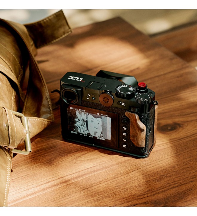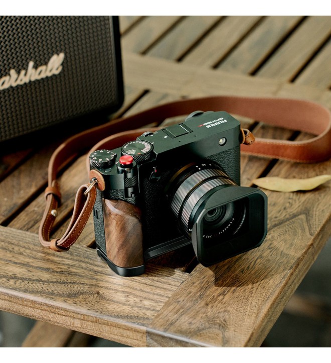 The dual handle grips (front and rear) are ergonomically crafted to reduce strain during extended use while providing a superior grip. Crafted from solid wood, they not only bring a warm, natural texture but also impart a distinctive retro charm to your camera. The Back Thumb Pad is affixed with 3M adhesive for secure and residue-free attachment.