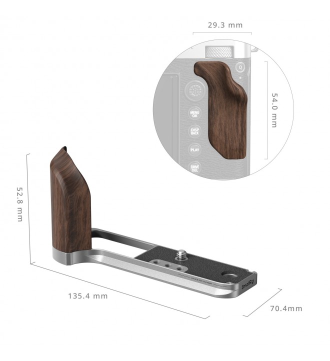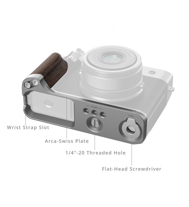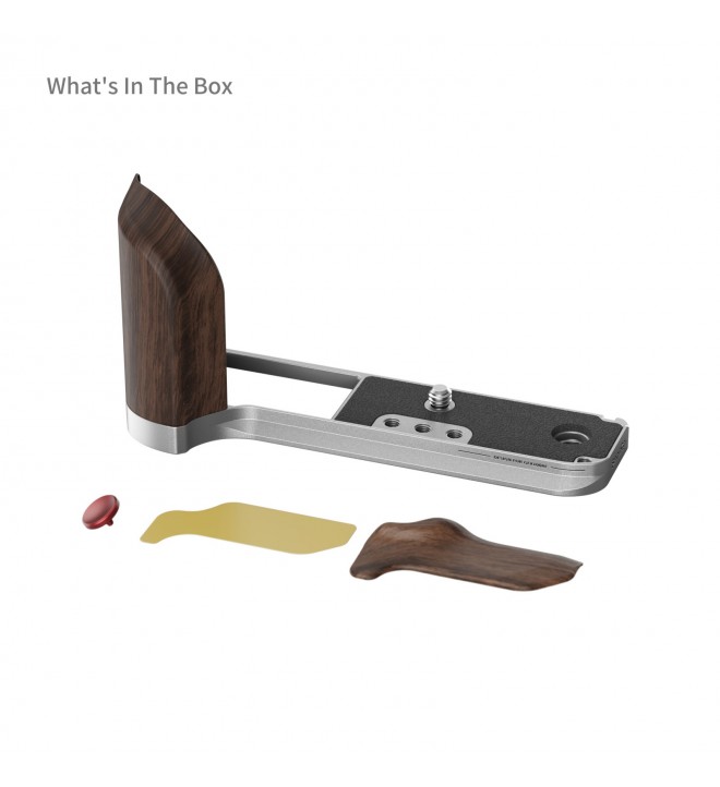 SmallRig L-Shape Mount Plate with Wooden Handle for FUJIFILM GFX100RF (Silver) 5265 is expertly designed to enhance both the aesthetics and control of your camera. It attaches securely with a 1/4"-20 screw and features built-in silicone pads to prevent scratches.