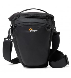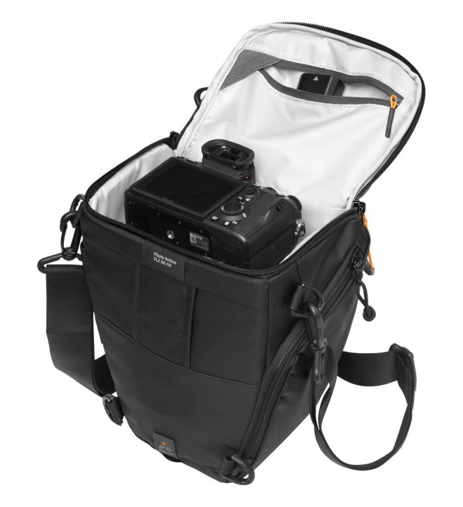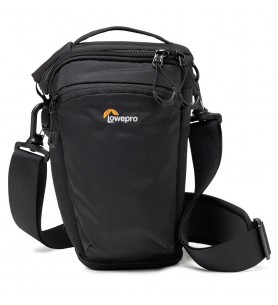 Naramna toploader torbica za DSLR brezzrcalni ali kompaktni fotoaparat z nameščenim objektivom (napr. Sony A9 z objektivom 70-200/2,8 ali napr. Nikon Coolpix P1100) nudi dobro zaščito pred udarci, pršenjem vode in prahom. Ročaj za nošenje v roki in pas za nošenje čez ramo, možnost nošenja za pasom. AW prevleka za zaščito pred dežjem.
